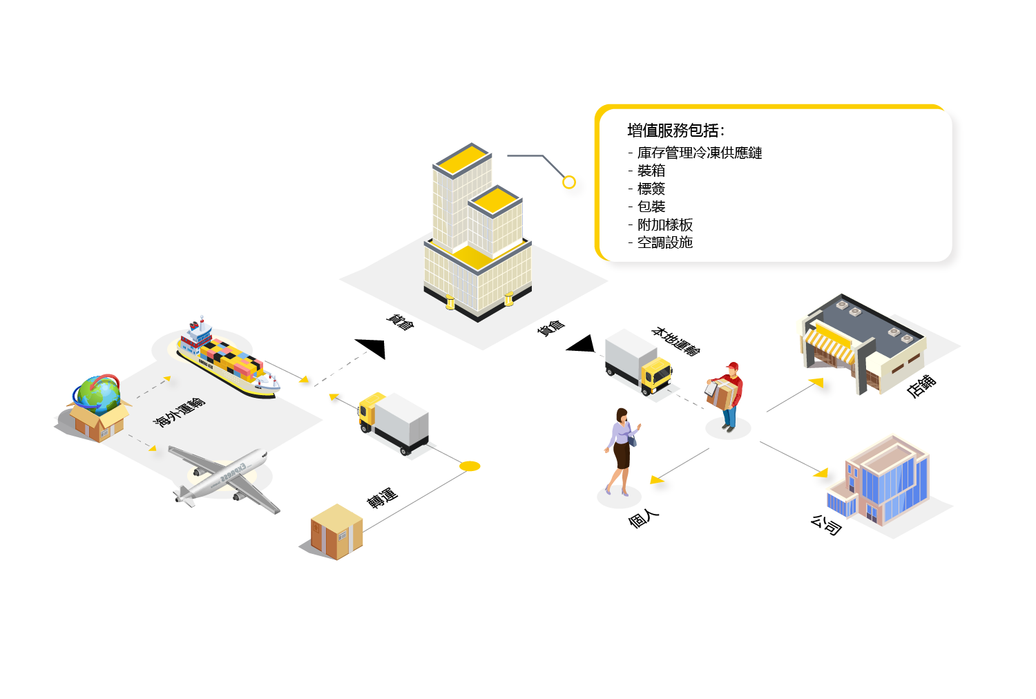 除了一般門對門派送外,我們亦為不同類型的企業提供一站式物流方案,按貨件種類、數量及其他要求度身訂造最合適的模式。